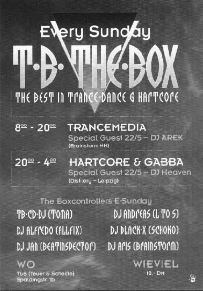😏T.B. The Box · The Best In Trance-Dance & Hartcorenordcore.deicallabels: eerste pinksterdag, pinksterweekend, Pinksterenzondag 22 mei 199420:00 – 04:00The Box (binnen) † Spaldingstr. 1bHamburgDuitsland🇩🇪hardcore × 4, tranceMinimumleeftijd?Leeftijdspecificatie is een indicatie. Twijfel je aan de correctheid, verifieer de correctheid op de website van de locatie of organisatie!18Line-up T.B. The Box Line-up is niet compleet.Black-X hardcoreHeaven hardcoreTB-CD-DJ techno, hardcoreToma hardcoreStatistieken