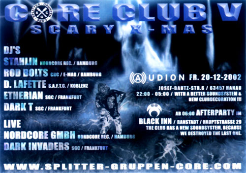 😏Core Club Ⅴ · Scary X-Masnordcore.deicalvrijdag 20 december 200222:00 – 05:00Audion (binnen) † Josef-Bautz Strasse 6HanauDuitsland🇩🇪darkcore × 2, terrorMinimumleeftijd?Leeftijdspecificatie is een indicatie. Twijfel je aan de correctheid, verifieer de correctheid op de website van de locatie of organisatie!18Line-up Core Club Ⅴ Line-up is niet compleet.Dark Invaders · live hardcoreDark-T hardcoreEtherianNordcore · live hardcoreRod BoltsStahlinStatistieken
