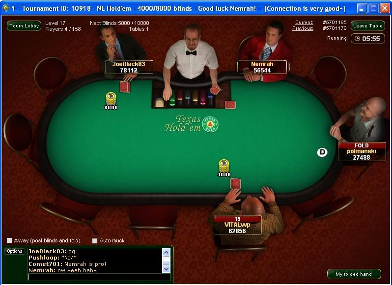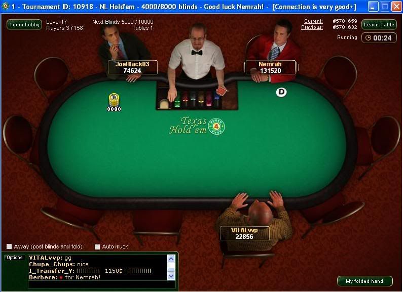 Was errug spannend aangezien vanaf bubbletime ik erg lowstacked was maar na veel folden als Stack 8 op de FT gekomen. Waarna ik met KK en AJs geloof ik quadruppelde B) beetje blijven hangen rond de plaatsen 1 tot 4 waarna ik bij de laatste 4 allin ga met volgens mij AJs en win van KJ (( ?? )). Nu was ik ruim CL en ik ging de HU in met net zoveel chips als mn opponent. Na een paar keer over en weer folden call de sb mijn bb ik besluit tot een 5x BB raise. ( 1/3 de van mn stack hehe) , sb gooit hem allin en ik fold natuurlijk met mn crap :P.