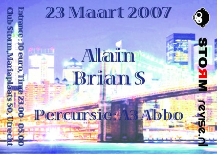 Locatie: Club Storm Utrecht Datum: 23 maart 2007 Line-up: Brain S, Alain, A3abbo Tickets: 10,- vvk (via de ticketpage op revise.nl)
