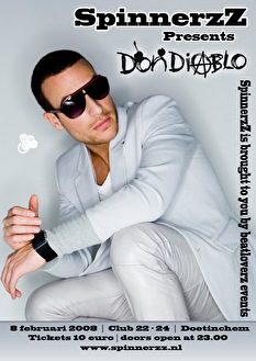De eerste SpinnerzZ in club 22-24 Doetinchem met een Line-Up waar je u tegen zegt. Maar liefst 4 top DJ's onder aanvoering van Don Diablo gaan de lekkerste beatz uit de Speakers pompen. Ook is er een van de beste MC's van Nederland aanwezig namelijk MC Pryme. Pryme is bekend van de hit Back by Any Demand van Sander van Doorn.