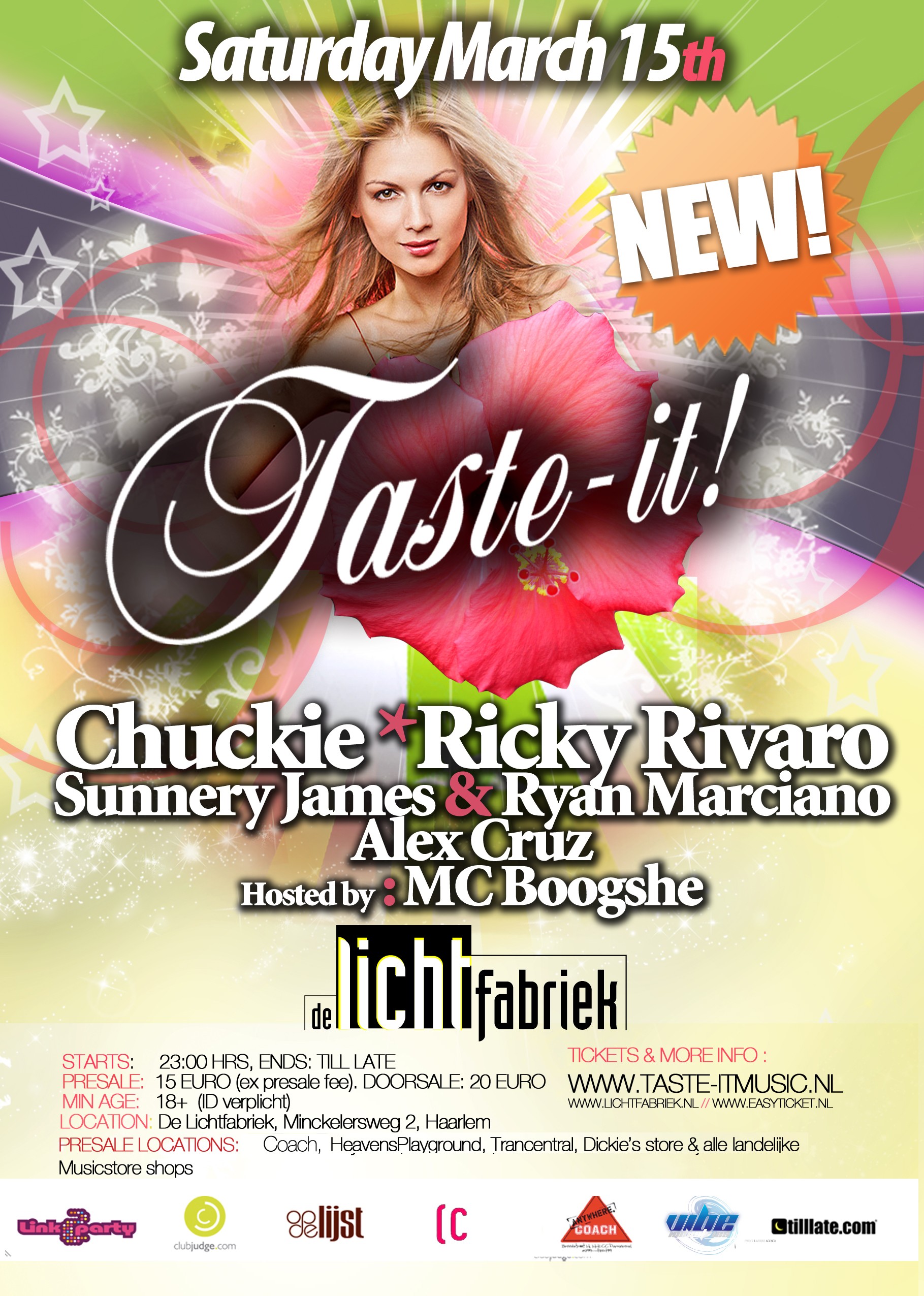 Taste-it! staat al tijden bekend als het feest voor iedereen die houdt van deep, soulfull, maar ook rocking house music! Een avond vol pumping beats en uplifting sounds, ijzingwekkend sterke vocals en te gekke loops, Taste-it! has got it all! Bij Taste-it! is alleen het beste goed genoeg, en dat blijkt dan ook wel uit de indrukwekkende line-up van de eerste Haarlemse editie! This will definitely be Haarlem’s finest baby!
